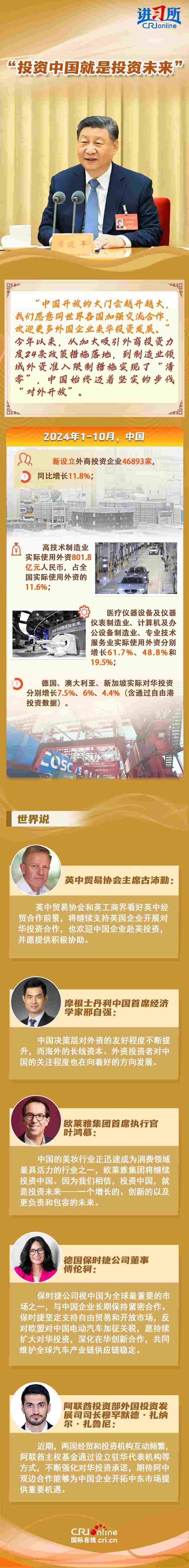 “中國(guó)是實(shí)干家、行動(dòng)派?!苯衲暌詠?lái),從習(xí)近平主席的歐洲之行到拉美之行,再到四天前在北京會(huì)見(jiàn)主要國(guó)際經(jīng)濟(jì)組織負(fù)責(zé)人,習(xí)近平一直強(qiáng)調(diào),中國(guó)的發(fā)展將給世界帶來(lái)巨大機(jī)遇。據(jù)聯(lián)合國(guó)貿(mào)易和發(fā)展會(huì)議不久前發(fā)布的《世界投資報(bào)告2024》中文版顯示,中國(guó)吸引外資的結(jié)構(gòu)不斷優(yōu)化、質(zhì)量不斷提高,多位政商界人士也認(rèn)為中國(guó)是一個(gè)非常有前景的市場(chǎng),投資中國(guó)就是投資未來(lái)。