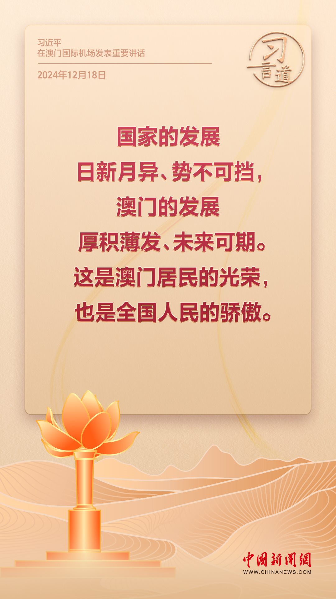 2024年是澳門回歸祖國25周年。多年來,習近平主席始終關注澳門經濟社會發(fā)展、百姓福祉,寄語“澳門的發(fā)展厚積薄發(fā)、未來可期”。