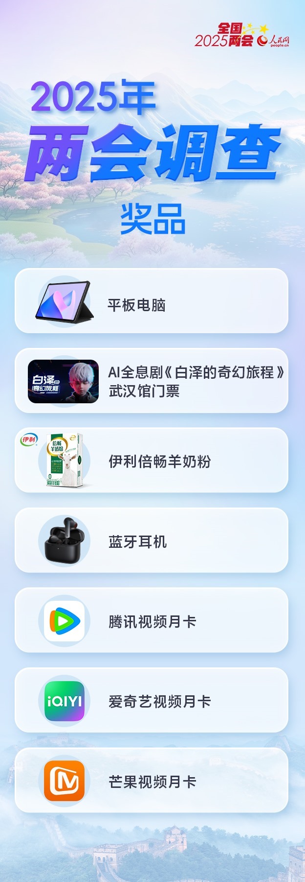 為感謝網(wǎng)友對人民網(wǎng)2025年全國兩會調(diào)查的支持,參與者有機會抽取精美獎品1份。