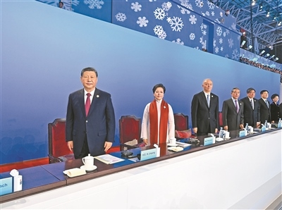 19時(shí)58分,在《和平——命運(yùn)共同體》的樂曲聲中,習(xí)近平和夫人彭麗媛,同國(guó)際奧委會(huì)主席巴赫、亞奧理事會(huì)第一副主席霍震霆等步入主席臺(tái),向觀眾揮手致意。全場(chǎng)響起長(zhǎng)時(shí)間的熱烈掌聲。