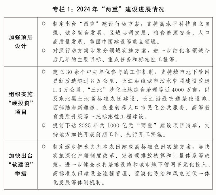 二是發(fā)行超長(zhǎng)期特別國(guó)債支持“兩重”建設(shè)取得積極進(jìn)展。著眼于系統(tǒng)解決強(qiáng)國(guó)建設(shè)、民族復(fù)興進(jìn)程中一些重大項(xiàng)目建設(shè)的資金問(wèn)題,從2024年起發(fā)行超長(zhǎng)期特別國(guó)債支持國(guó)家重大戰(zhàn)略和重點(diǎn)領(lǐng)域安全能力建設(shè)。堅(jiān)持自上而下、軟硬結(jié)合,建立實(shí)施項(xiàng)目?jī)?chǔ)備、集中聯(lián)審、??顚S?、強(qiáng)化監(jiān)督等全鏈條推進(jìn)保障機(jī)制?!坝餐顿Y”方面,嚴(yán)格做好項(xiàng)目篩選,2024年安排7000億元超長(zhǎng)期特別國(guó)債支持1465個(gè)重大項(xiàng)目建設(shè),項(xiàng)目基本全部開(kāi)工、全年完成投資超過(guò)1.2萬(wàn)億元。“軟建設(shè)”方面,堅(jiān)持項(xiàng)目建設(shè)和配套改革相結(jié)合,扎實(shí)推進(jìn)規(guī)劃編制、政策制定和體制機(jī)制改革創(chuàng)新,不斷完善投入機(jī)制、提高投入效率。規(guī)范項(xiàng)目全過(guò)程管理方面,出臺(tái)“兩重”建設(shè)有關(guān)管理辦法,督促項(xiàng)目加快開(kāi)工建設(shè),嚴(yán)格資金監(jiān)管,加強(qiáng)監(jiān)測(cè)調(diào)度和現(xiàn)場(chǎng)監(jiān)督檢查,確保建成優(yōu)質(zhì)工程、精品工程、放心工程。