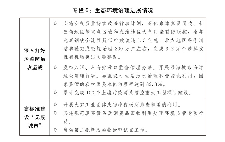 一是生態(tài)環(huán)境質(zhì)量持續(xù)改善。深入打好藍(lán)天、碧水、凈土保衛(wèi)戰(zhàn),全國(guó)地級(jí)及以上城市細(xì)顆粒物(PM2.5)平均濃度為29.3微克/立方米、下降2.7%,空氣質(zhì)量?jī)?yōu)良天數(shù)比率為87.2%;地表水質(zhì)量達(dá)到或好于Ⅲ類水體比例為90.4%,城市生活污水集中收集率76.6%;化學(xué)需氧量排放量、氨氮排放量、揮發(fā)性有機(jī)物排放量、氮氧化物排放量持續(xù)下降。印發(fā)土壤污染源頭防控行動(dòng)計(jì)劃。深入實(shí)施環(huán)境基礎(chǔ)設(shè)施建設(shè)水平提升行動(dòng),強(qiáng)化塑料污染和過(guò)度包裝全鏈條治理,深入推進(jìn)快遞包裝綠色轉(zhuǎn)型。