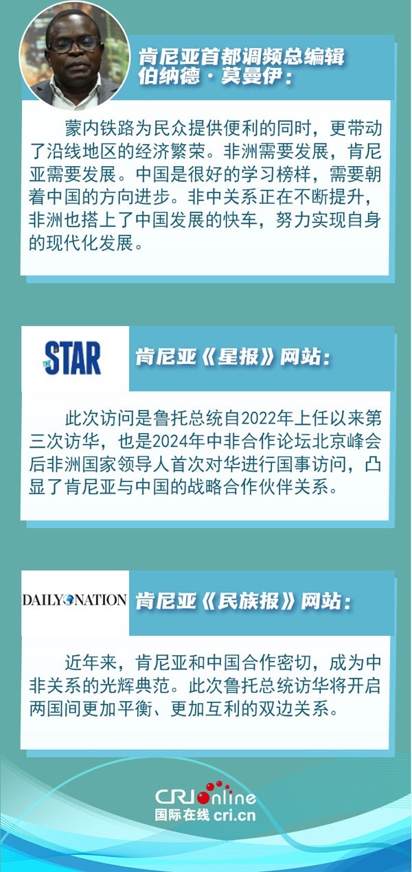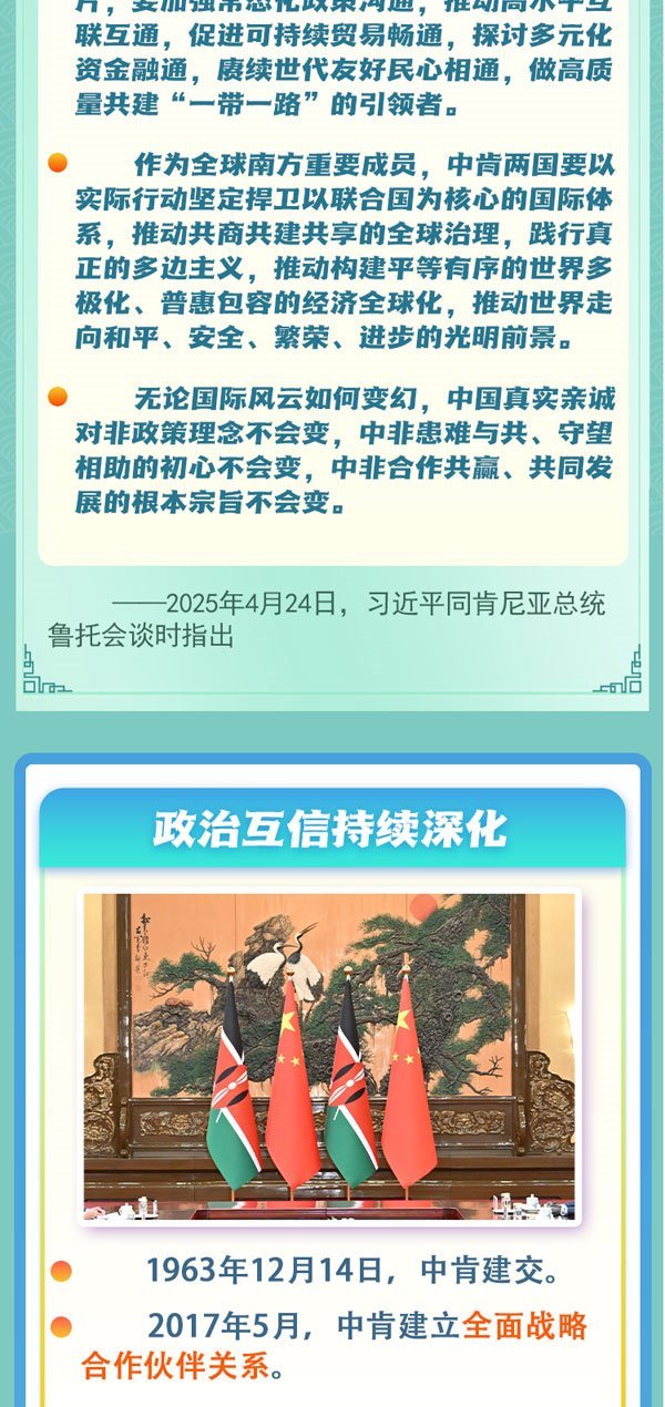 中肯友誼源于古老的海上絲綢之路。新時代以來中肯兩國高層交往密切,政治互信持續(xù)深化??夏醽喐鹘缯J為,肯中合作秉持共同愿景,非洲國家應(yīng)充分發(fā)揮非中合作潛力,攜手建設(shè)更加公平公正、多元繁榮的世界。