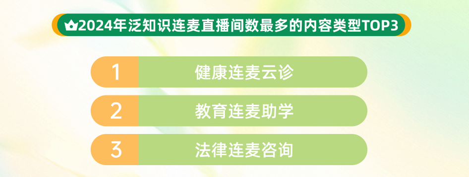 隨著用戶互動與創(chuàng)作者投稿形成正向循環(huán),推動生態(tài)雙向繁榮,連麥學習正重塑知識普惠的全新范式。數(shù)據(jù)顯示,2024年,快手泛知識連麥直播場次達491萬場,直播間互動量同比提升23%,健康咨詢、教育助學、法律咨詢位列連麥內容前三?! ?/p>