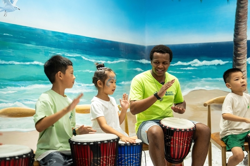 2024年8月30日,在位于湖南高橋大市場的中非經(jīng)貿(mào)博覽會常設(shè)展館安哥拉館,志愿者(右二)帶領(lǐng)學生學習非洲鼓。新華社記者 陳思汗 攝