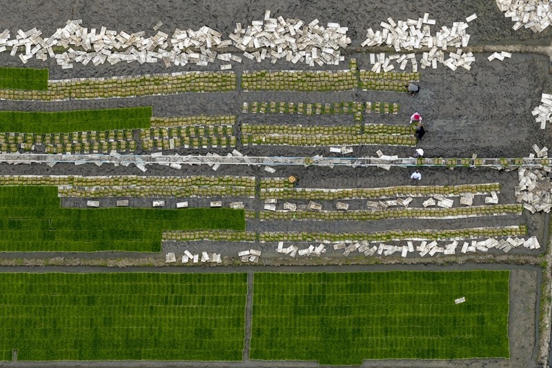 6月19日,在江蘇省連云港市東??h張灣鄉(xiāng)張灣村秧板田里,農(nóng)民起水稻秧苗準備進行機插作業(yè)(無人機照片)。