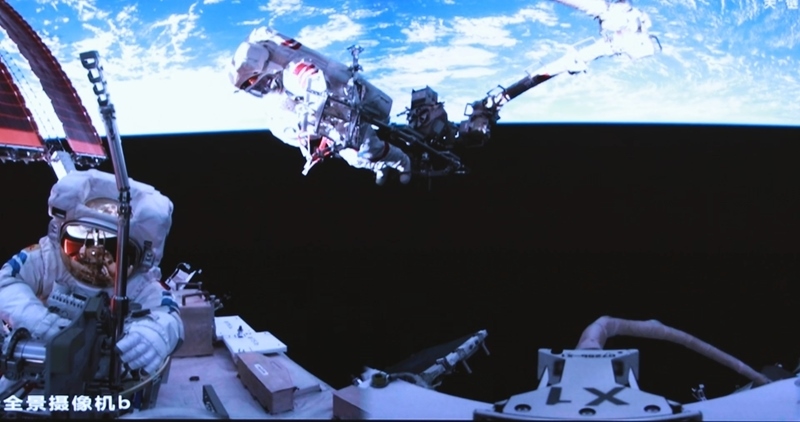 這是6月26日在北京航天飛行控制中心屏幕上拍攝的神舟二十號(hào)航天員陳冬(左)與陳中瑞在空間站組合體艙外工作的畫面。新華社發(fā)(周柯毅 攝)