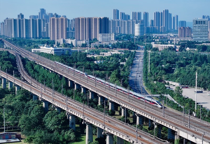 6月30日,一列動(dòng)車組列車經(jīng)過(guò)武漢天興洲大橋延長(zhǎng)線(無(wú)人機(jī)照片)。