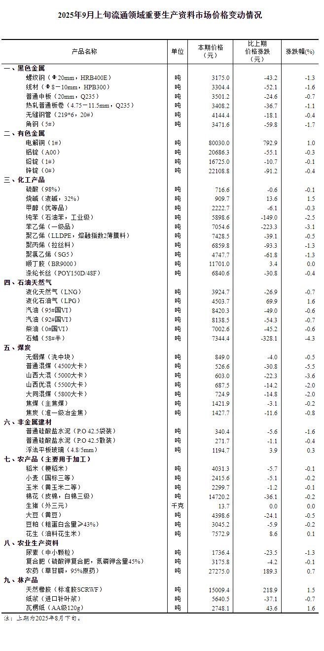 據(jù)國家統(tǒng)計(jì)局網(wǎng)站消息,國家統(tǒng)計(jì)局14日公布2025年9月上旬流通領(lǐng)域重要生產(chǎn)資料市場(chǎng)價(jià)格變動(dòng)情況。