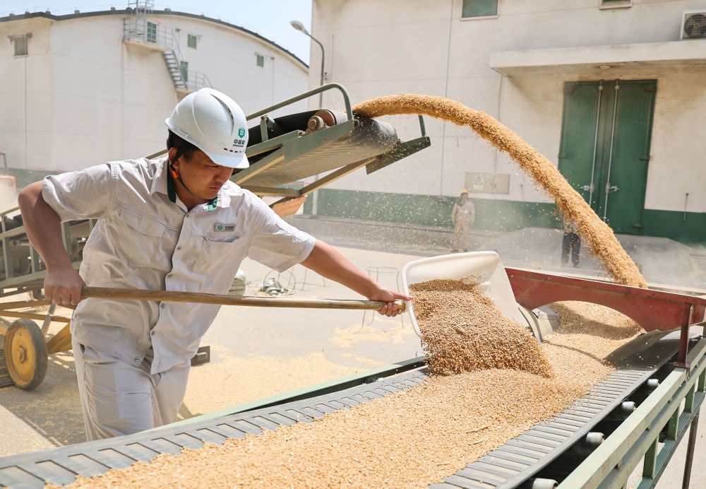 在江蘇連云港市連云區(qū)的中央儲備糧連云港直屬庫糧食收購作業(yè)區(qū),工作人員用傳輸機傳送小麥入庫(2025年6月18日攝)。新華社發(fā)(王健民攝)