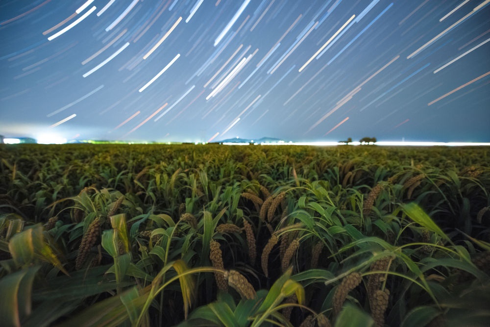 在黑龍江省佳木斯市富錦市拍攝的星空下的谷子(2025年9月17日攝,堆棧合成照片)。新華社發(fā)(曲玉寶攝)