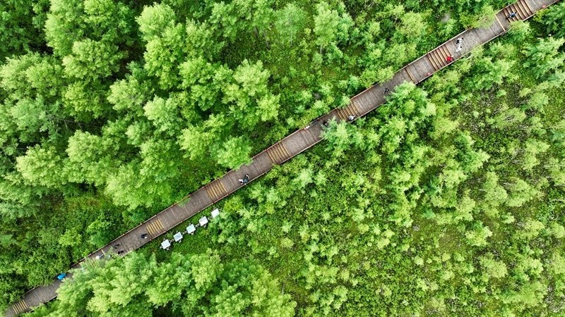 7月5日,游客在內(nèi)蒙古阿爾山國家森林公園游玩(無人機(jī)照片)。