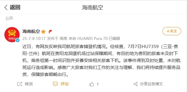 據(jù)海南航空官方微博消息,近日,有網(wǎng)友反映海南航空航班旅客錯(cuò)登機(jī)情況。經(jīng)核查,7月7日HU7359(三亞-貴陽-蘭州)航班在貴陽龍洞堡機(jī)場過站保障期間,有目的地為貴陽的旅客未及時(shí)下機(jī),乘務(wù)組第一時(shí)間識別并妥善安排相關(guān)旅客下機(jī)。該事件得到及時(shí)處置,未對航班運(yùn)行造成影響。