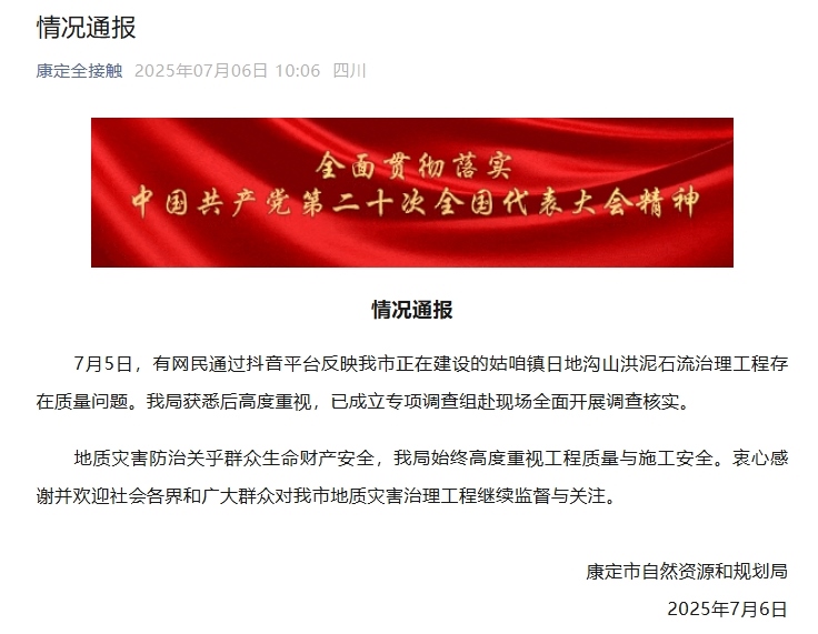 中新網(wǎng)7月6日電 據(jù)“康定全接觸”微信公眾號消息,7月5日,有網(wǎng)民通過抖音平臺反映四川省康定市正在建設(shè)的姑咱鎮(zhèn)日地溝山洪泥石流治理工程存在質(zhì)量問題??刀ㄊ凶匀毁Y源和規(guī)劃局獲悉后高度重視,已成立專項調(diào)查組赴現(xiàn)場全面開展調(diào)查核實。