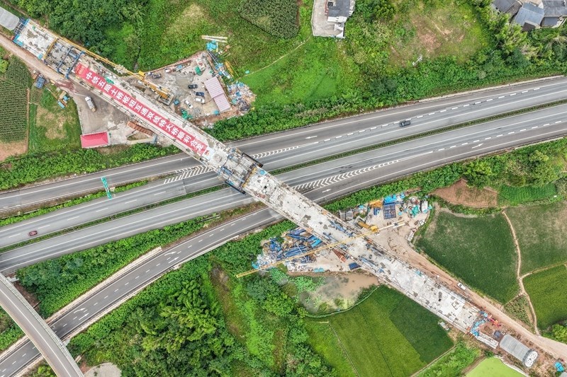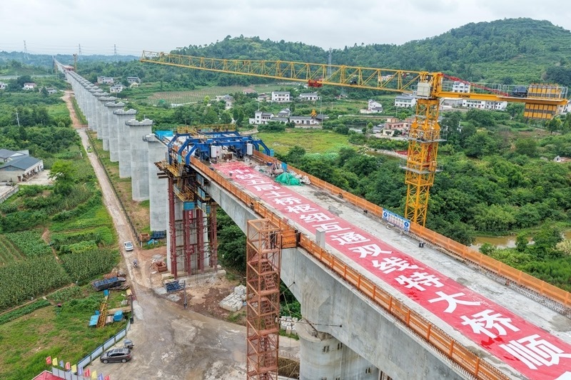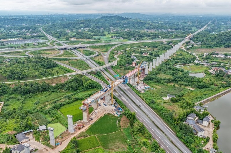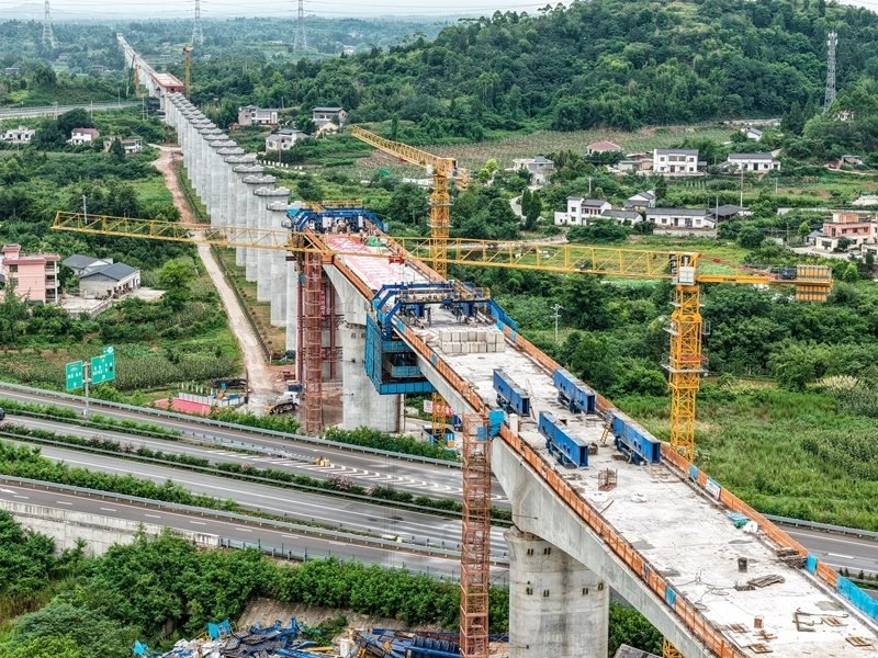 這是7月8日拍攝的成渝中線高鐵土橋樞紐互通雙線特大橋建設現場(無人機照片)。