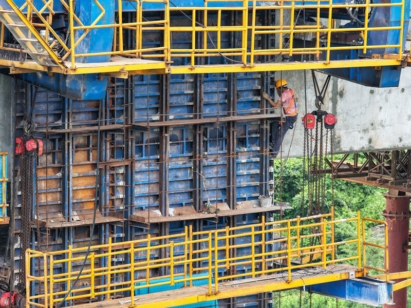 7月8日,工人在成渝中線高鐵土橋樞紐互通雙線特大橋建設現場施工作業(yè)(無人機照片)。