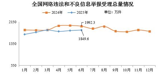 中新網(wǎng)7月9日電 據(jù)“中央網(wǎng)信辦舉報中心”微信公眾號消息,2025年6月,中央網(wǎng)信辦舉報中心指導(dǎo)全國各級網(wǎng)信舉報工作部門、主要網(wǎng)站平臺受理網(wǎng)民舉報色情、賭博、侵權(quán)、謠言等違法和不良信息1849.6萬件,環(huán)比增長1.1%、同比下降7.2%。其中,中央網(wǎng)信辦舉報中心受理舉報39.8萬件,環(huán)比下降9.5%、同比下降15.1%;各地網(wǎng)信舉報工作部門受理舉報63.7萬件,環(huán)比增長6.6%、同比下降50%;全國主要網(wǎng)站平臺受理舉報1746.1萬件,環(huán)比增長1.2%、同比下降4%。