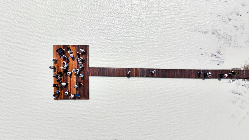 7月11日,游客在內(nèi)蒙古錫林郭勒盟太仆寺旗白音查干湖游玩(無人機(jī)照片)。
