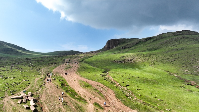 7月11日,游客在內(nèi)蒙古錫林郭勒盟太仆寺旗石條山游玩(無人機(jī)照片)。