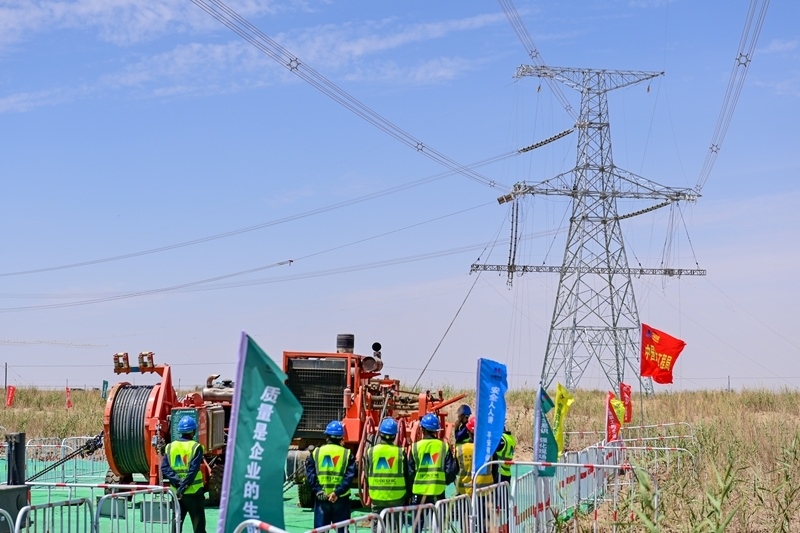 在民豐-且末750千伏線路,作業(yè)人員進行導(dǎo)線架設(shè)工作(7月11日攝)。