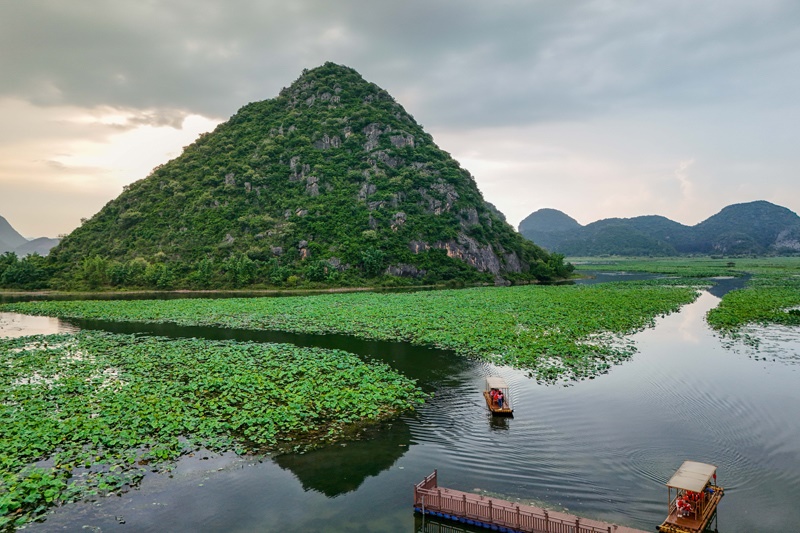 盛夏時(shí)節(jié),云南省文山壯族苗族自治州丘北縣普者黑景區(qū)內(nèi)萬(wàn)畝荷花初綻,碧葉連天,與獨(dú)特的喀斯特峰林、清澈湖泊繪就一幅獨(dú)具特色的山水畫(huà)卷,吸引八方游客紛至沓來(lái)。