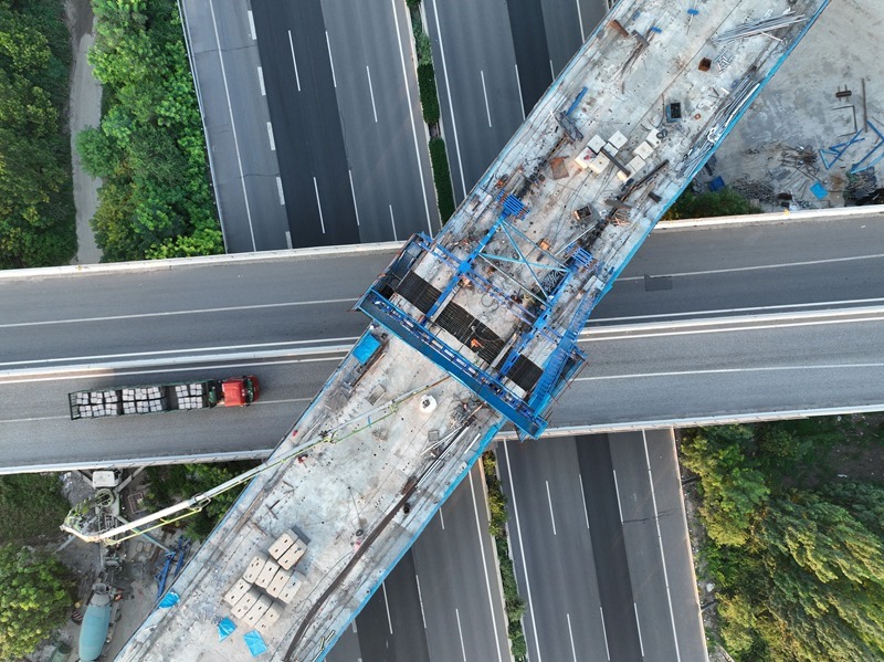 7月18日拍攝的雄忻高鐵保定東特大橋跨京港澳高速連續(xù)梁中跨施工現(xiàn)場(無人機照片)。