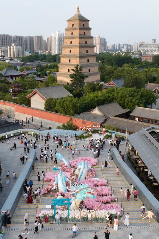 游客在位于西安大雁塔附近的大悅城觀景平臺上游玩拍照(7月16日攝,無人機(jī)照片)。