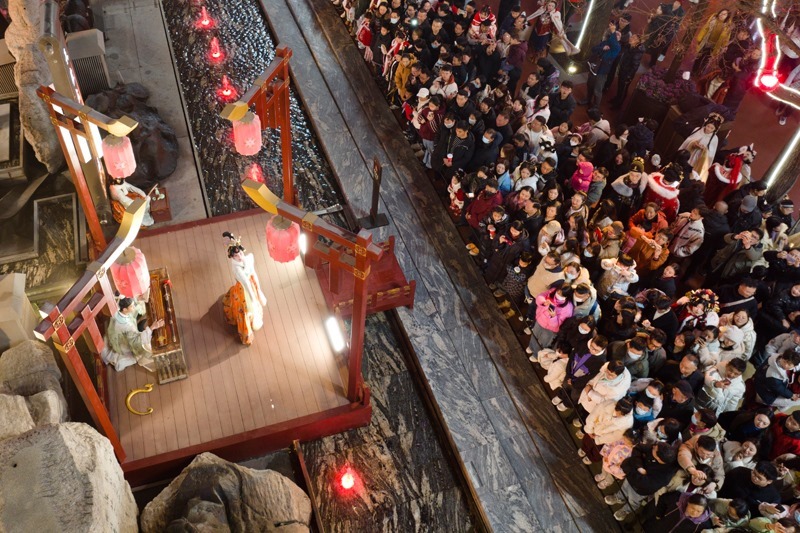 游客在西安大唐不夜城街區(qū)觀看以唐代歷史文化為背景創(chuàng)作的情景劇(1月22日攝,無人機(jī)照片)。