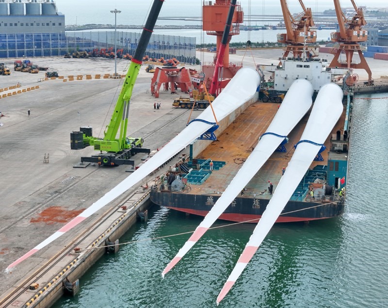 7月31日,在山東港口煙臺港蓬萊港區(qū),超大尺寸海上風(fēng)電葉片被吊裝上船(無人機照片)。