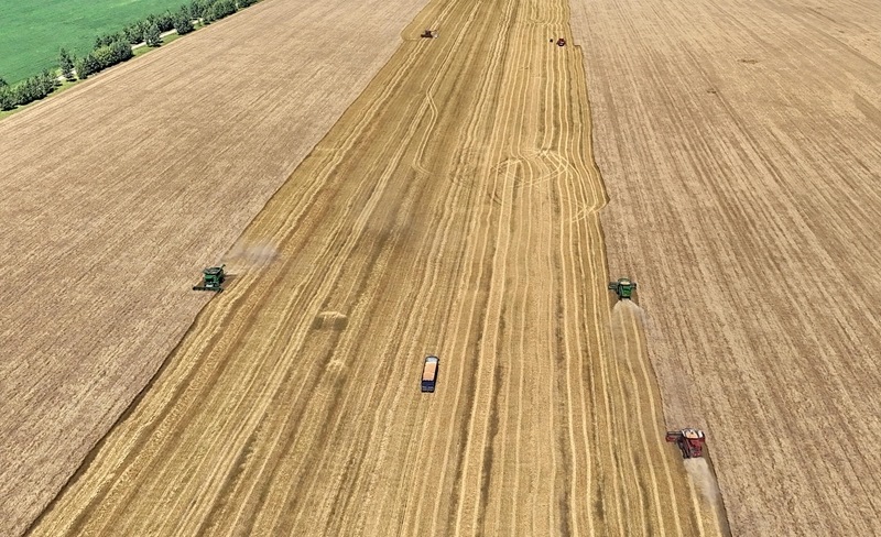 8月5日,在北大荒集團(tuán)黑龍江紅星農(nóng)場(chǎng)第二管理區(qū),大型收割機(jī)在搶收小麥(無(wú)人機(jī)照片)。