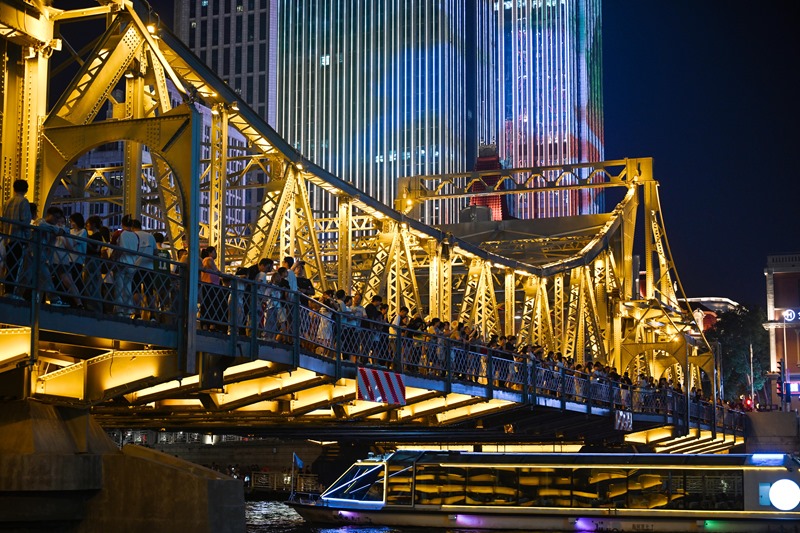 8月11日,市民游客在天津海河解放橋上欣賞城市夜景。
