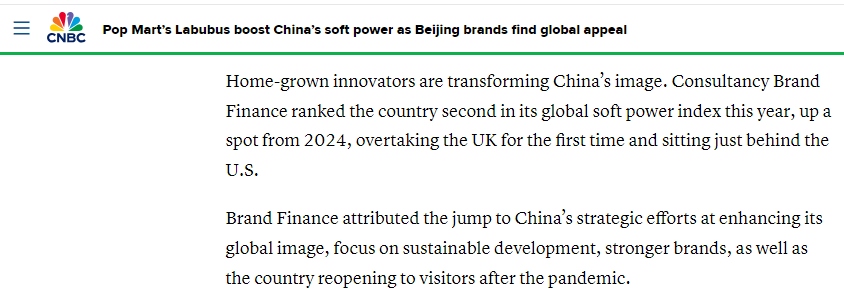 文章說(shuō),英國(guó)“品牌金融”咨詢公司今年發(fā)布的全球軟實(shí)力指數(shù)顯示,中國(guó)排名升至全球第二——較2024年上升一位,首次超越英國(guó),目前僅次于美國(guó)。該公司分析認(rèn)為,中國(guó)軟實(shí)力躍升的重要原因在于中國(guó)提升國(guó)際形象的戰(zhàn)略性舉措、對(duì)可持續(xù)發(fā)展的堅(jiān)定投入、日益增強(qiáng)的品牌實(shí)力,以及向全球游客敞開(kāi)國(guó)門。消費(fèi)分析師認(rèn)為,經(jīng)過(guò)這些努力,人們終于能穿透貼在中國(guó)產(chǎn)品身上的負(fù)面濾鏡,看清產(chǎn)品的真正價(jià)值,逐漸擺脫過(guò)去對(duì)“中國(guó)制造”的刻板偏見(jiàn)。