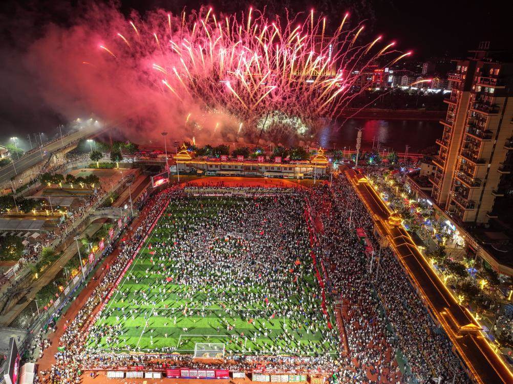 7月26日,貴州“村超”球場拍攝的煙花秀(無人機照片)。當日,貴州榕江舉行主題為“感恩重啟·貴州超力量”的超級星期六活動,球星巴喬、卡洛斯現(xiàn)場助陣,助力“村超”重燃賽事,正式回歸。新華社記者 楊文斌 攝