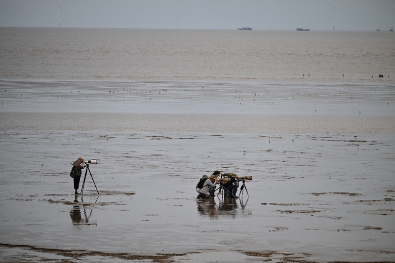 8月25日,攝影愛(ài)好者在東臺(tái)條子泥濕地拍鳥(niǎo)。
