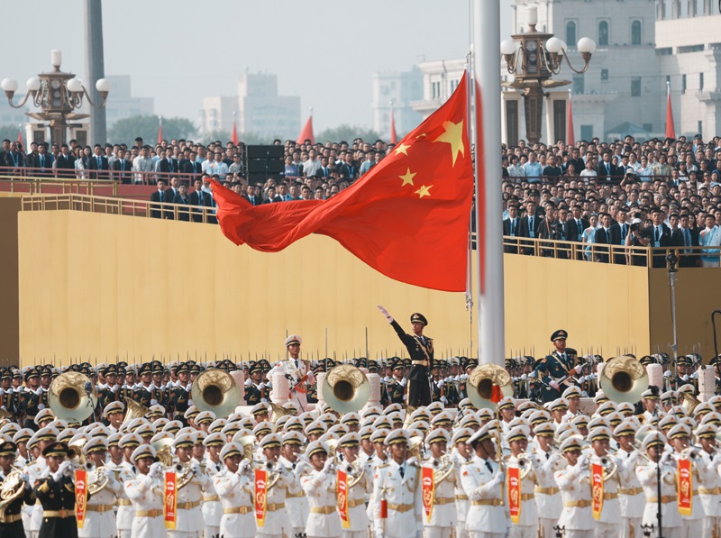 9月3日,紀(jì)念中國人民抗日戰(zhàn)爭暨世界反法西斯戰(zhàn)爭勝利80周年大會(huì)在北京隆重舉行。這是天安門廣場舉行隆重的升國旗儀式。