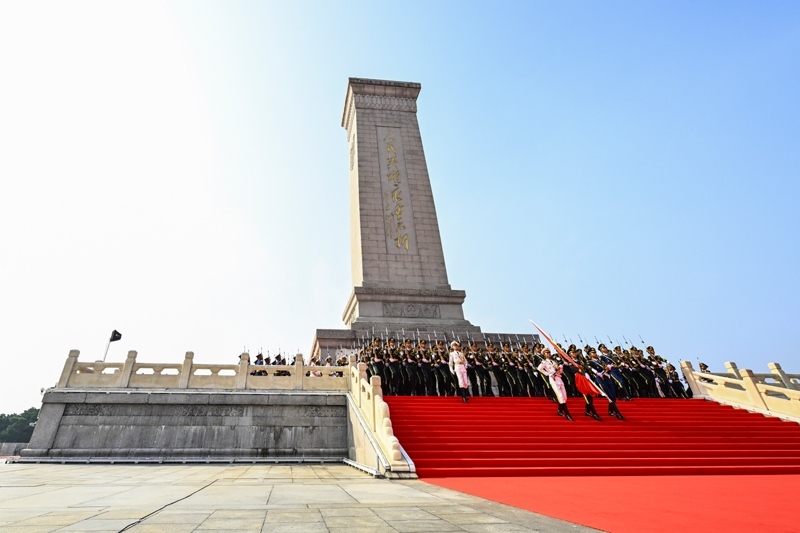 9月3日,紀(jì)念中國(guó)人民抗日戰(zhàn)爭(zhēng)暨世界反法西斯戰(zhàn)爭(zhēng)勝利80周年大會(huì)在北京隆重舉行。這是國(guó)旗護(hù)衛(wèi)隊(duì)從人民英雄紀(jì)念碑基座出發(fā),走向旗桿基座。