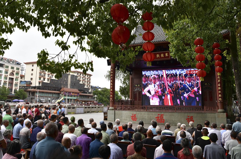 9月3日,在福建省三明市寧化縣,退伍軍人和群眾一起觀看紀(jì)念中國人民抗日戰(zhàn)爭暨世界反法西斯戰(zhàn)爭勝利80周年大會(huì)直播。