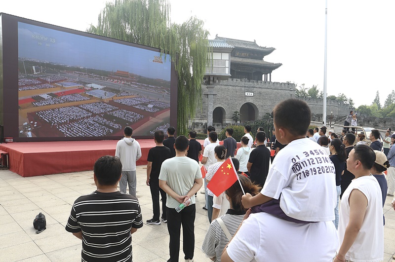 9月3日,游客在山東省棗莊市臺(tái)兒莊古城西門觀看紀(jì)念中國人民抗日戰(zhàn)爭暨世界反法西斯戰(zhàn)爭勝利80周年大會(huì)直播。