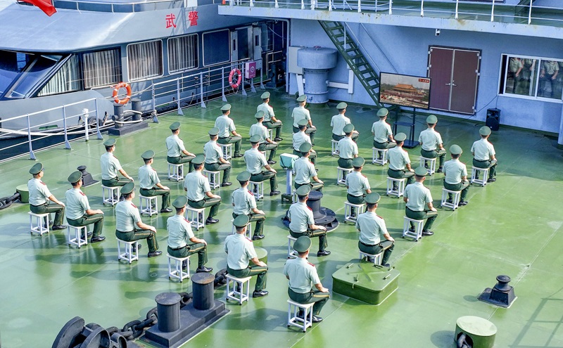 9月3日,武警江蘇總隊(duì)南京支隊(duì)船艇大隊(duì)官兵觀看紀(jì)念中國人民抗日戰(zhàn)爭暨世界反法西斯戰(zhàn)爭勝利80周年大會(huì)直播。