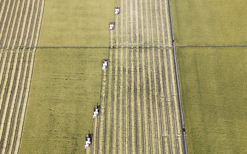 9月5日,在北大荒集團(tuán)黑龍江江川農(nóng)場(chǎng)有限公司水稻種植基地,農(nóng)機(jī)手操作農(nóng)機(jī)收割水稻(無(wú)人機(jī)照片)。