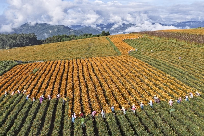 9月5日,農(nóng)民在云南騰沖市明光鎮(zhèn)鳳凰村鳳凰山采收萬(wàn)壽菊(無(wú)人機(jī)照片)。