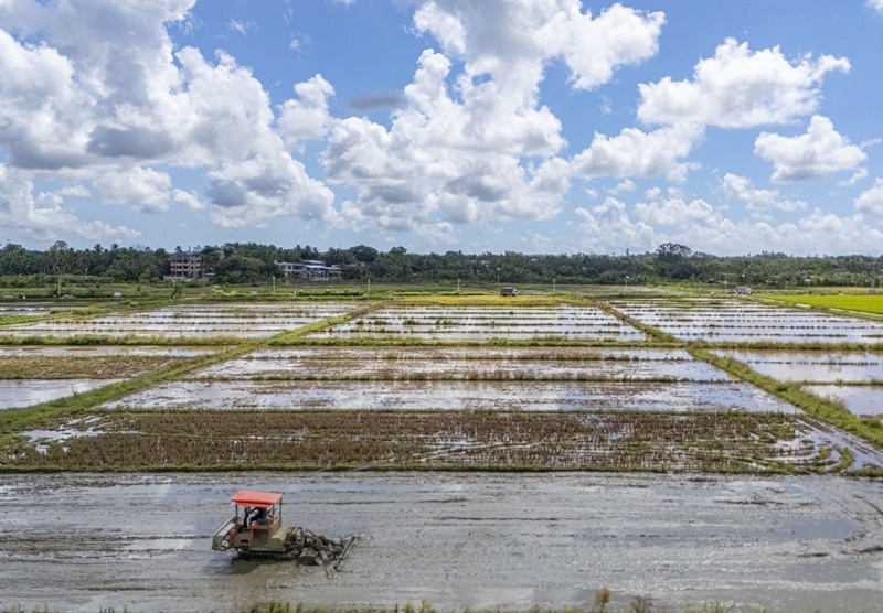 9月4日,海南省瓊海市農(nóng)機(jī)手在龍壽洋田野公園耕作(無(wú)人機(jī)照片)。