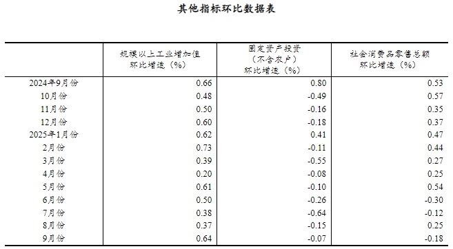 (2)根據(jù)季節(jié)調(diào)整模型自動(dòng)修正結(jié)果,對(duì)近一年來各期國內(nèi)生產(chǎn)總值、規(guī)模以上工業(yè)增加值、固定資產(chǎn)投資(不含農(nóng)戶)、社會(huì)消費(fèi)品零售總額環(huán)比增速進(jìn)行修訂。修訂結(jié)果及2025年三季度GDP環(huán)比數(shù)據(jù)、2025年9月份其他指標(biāo)環(huán)比數(shù)據(jù)如下: