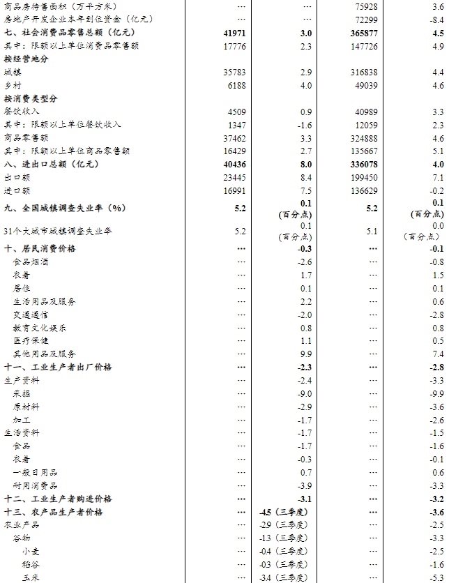 前三季度,社會(huì)消費(fèi)品零售總額365877億元,同比增長4.5%。按經(jīng)營單位所在地分,城鎮(zhèn)消費(fèi)品零售額316838億元,同比增長4.4%;鄉(xiāng)村消費(fèi)品零售額49039億元,增長4.6%。按消費(fèi)類型分,商品零售額324888億元,增長4.6%;餐飲收入40989億元,增長3.3%?;旧铑惡筒糠稚?jí)類商品銷售增勢較好,限額以上單位糧油食品類、體育娛樂用品類、金銀珠寶類商品零售額分別增長10.4%、19.6%、11.5%。消費(fèi)品以舊換新政策持續(xù)顯效,限額以上單位家用電器和音像器材類、家具類、通訊器材類、文化辦公用品類商品零售額分別增長25.3%、21.3%、20.5%、19.9%。全國網(wǎng)上零售額112830億元,同比增長9.8%。其中,實(shí)物商品網(wǎng)上零售額91528億元,增長6.5%,占社會(huì)消費(fèi)品零售總額的比重為25.0%。9月份,社會(huì)消費(fèi)品零售總額同比增長3.0%,環(huán)比下降0.18%。前三季度,服務(wù)零售額同比增長5.2%。其中,文體休閑服務(wù)類、通訊信息服務(wù)類、旅游咨詢租賃服務(wù)類、交通出行服務(wù)類零售額較快增長。