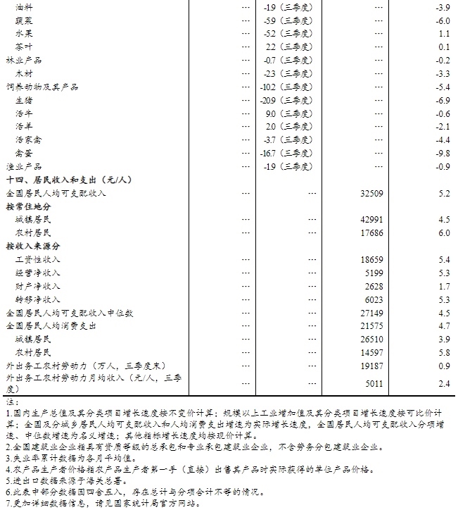 前三季度,全國居民人均可支配收入32509元,同比名義增長5.1%,扣除價(jià)格因素實(shí)際增長5.2%。按常住地分,城鎮(zhèn)居民人均可支配收入42991元,同比名義增長4.4%,實(shí)際增長4.5%;農(nóng)村居民人均可支配收入17686元,同比名義增長5.7%,實(shí)際增長6.0%。從收入來源看,全國居民人均工資性收入、經(jīng)營凈收入、財(cái)產(chǎn)凈收入、轉(zhuǎn)移凈收入分別名義增長5.4%、5.3%、1.7%、5.3%。全國居民人均可支配收入中位數(shù)27149元,同比名義增長4.5%。