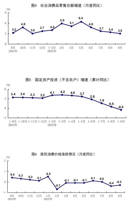 前三季度,全國居民消費(fèi)價(jià)格(CPI)同比下降0.1%。分類別看,食品煙酒價(jià)格下降0.8%,衣著價(jià)格上漲1.5%,居住價(jià)格上漲0.1%,生活用品及服務(wù)價(jià)格上漲0.6%,交通通信價(jià)格下降2.8%,教育文化娛樂價(jià)格上漲0.8%,醫(yī)療保健價(jià)格上漲0.5%,其他用品及服務(wù)價(jià)格上漲7.4%。在食品煙酒價(jià)格中,鮮菜價(jià)格下降7.9%,豬肉價(jià)格下降2.9%,糧食價(jià)格下降1.2%,鮮果價(jià)格上漲1.2%。9月份,全國居民消費(fèi)價(jià)格同比下降0.3%,環(huán)比上漲0.1%。前三季度,扣除食品和能源價(jià)格后的核心CPI同比上漲0.6%,漲幅比上半年擴(kuò)大0.2個(gè)百分點(diǎn)。其中,9月份核心CPI同比上漲1.0%,比上月擴(kuò)大0.1個(gè)百分點(diǎn)。
