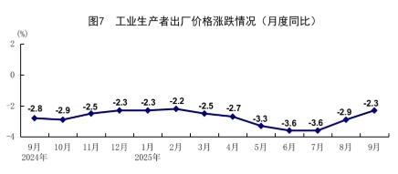 前三季度,全國工業(yè)生產(chǎn)者出廠價(jià)格同比下降2.8%。其中,9月份同比下降2.3%,降幅比上月收窄0.6個(gè)百分點(diǎn),環(huán)比持平。前三季度,工業(yè)生產(chǎn)者購進(jìn)價(jià)格同比下降3.2%。其中,9月份同比下降3.1%,降幅比上月收窄0.9個(gè)百分點(diǎn),環(huán)比上漲0.1%。