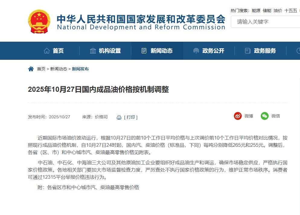中國(guó)網(wǎng)10月27日訊 據(jù)國(guó)家發(fā)改委網(wǎng)站消息,近期國(guó)際市場(chǎng)油價(jià)波動(dòng)運(yùn)行,根據(jù)10月27日的前10個(gè)工作日平均價(jià)格與上次調(diào)價(jià)前10個(gè)工作日平均價(jià)格對(duì)比情況,按照現(xiàn)行成品油價(jià)格機(jī)制,自10月27日24時(shí)起,國(guó)內(nèi)汽、柴油價(jià)格(標(biāo)準(zhǔn)品,下同)每噸分別降低265元和255元。調(diào)整后,各?。▍^(qū)、市)和中心城市汽、柴油最高零售價(jià)格見(jiàn)附表。
