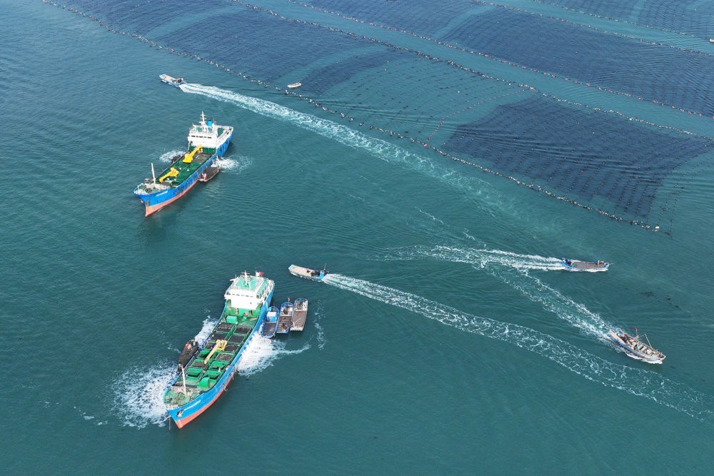 ↑ 11月10日,在山東省榮成市桑溝灣海洋牧場,養(yǎng)殖工人在養(yǎng)殖區(qū)穿梭作業(yè)(無人機(jī)照片)。新華社發(fā)(王福東 攝)