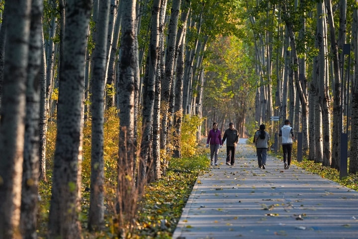 市民在北京市朝陽(yáng)區(qū)的朝陽(yáng)綠道上散步休閑(2025年11月14日攝)。新華社記者 鞠煥宗 攝